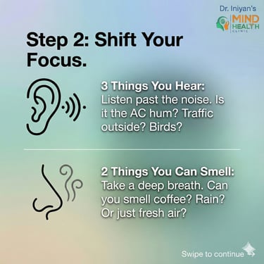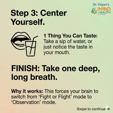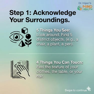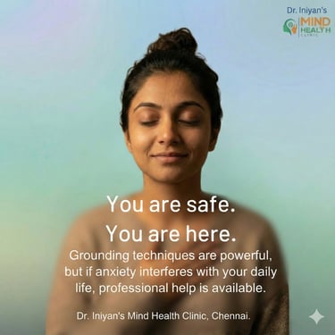 At Dr. Iniyan's Mind Health Clinic, we believe in empowering our patients with practical tools alongside professional treatment. Next time you feel overwhelmed, try this "Grounding" exercise to bring your mind back to the present: π 5 Things you see: Look around and name 5 objects. β 4 Things you feel: Touch the fabric of your chair, your clothes, or the table. π 3 Things you hear: Listen for traffic, birds, or the AC hum. π 2 Things you smell: Take a deep breath. Notice any scents. π 1 Thing you taste: Take a sip of water. This technique helps disengage the "fight or flight" response. While this tool is helpful for immediate relief, chronic anxiety requires professional care. If anxiety is interfering with your work or relationships, book a consultation with us today. π Dr. Iniyan's Mind Health Clinic, Chennai Specializing in Anxiety, Depression, and Holistic Mental Wellness.